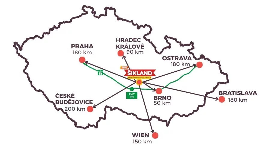 Areál Šiklandu se rozprostírá na 25ha uprostřed Vysočiny. Má tedy ideální polohu pro všechny návštěvníky z celé ČR.